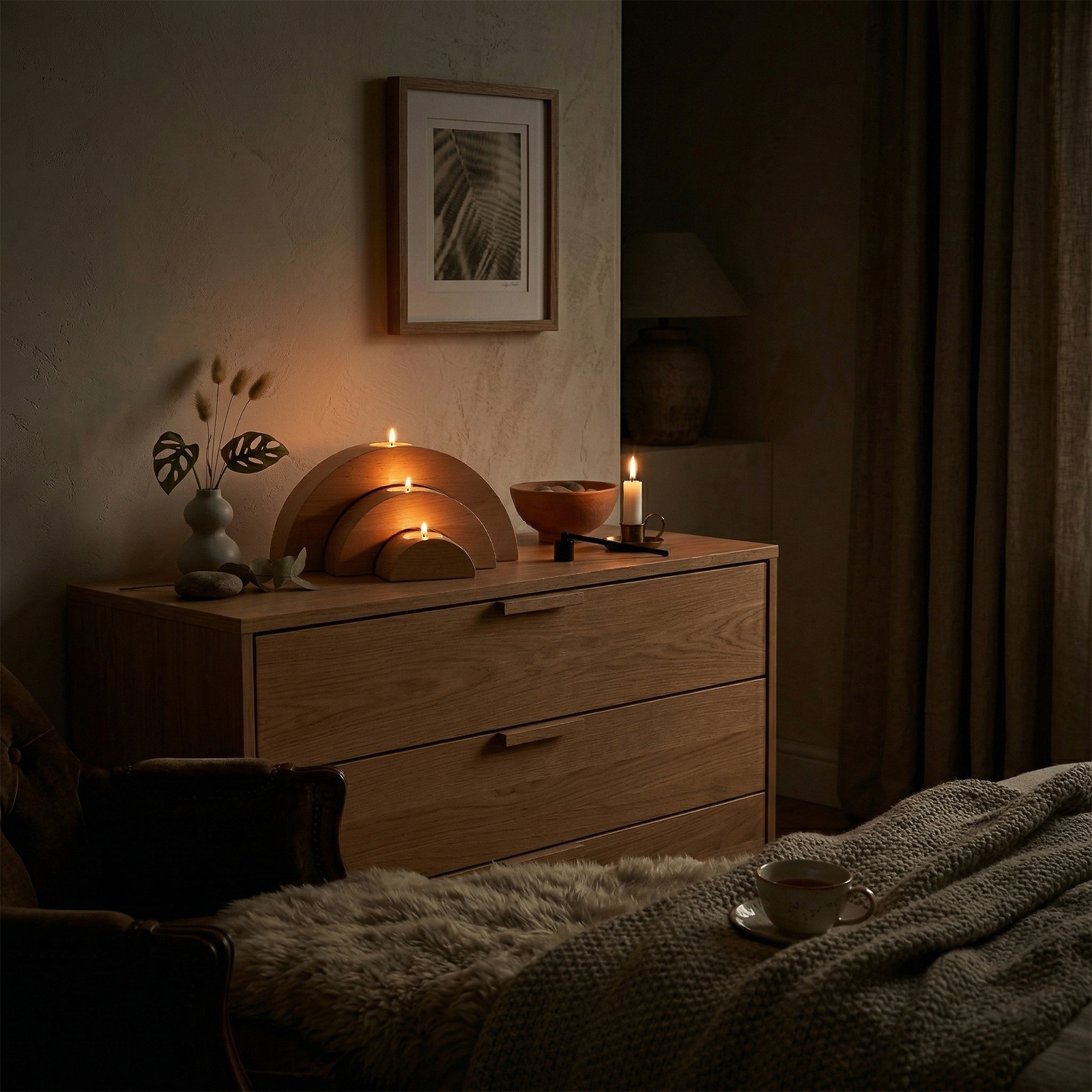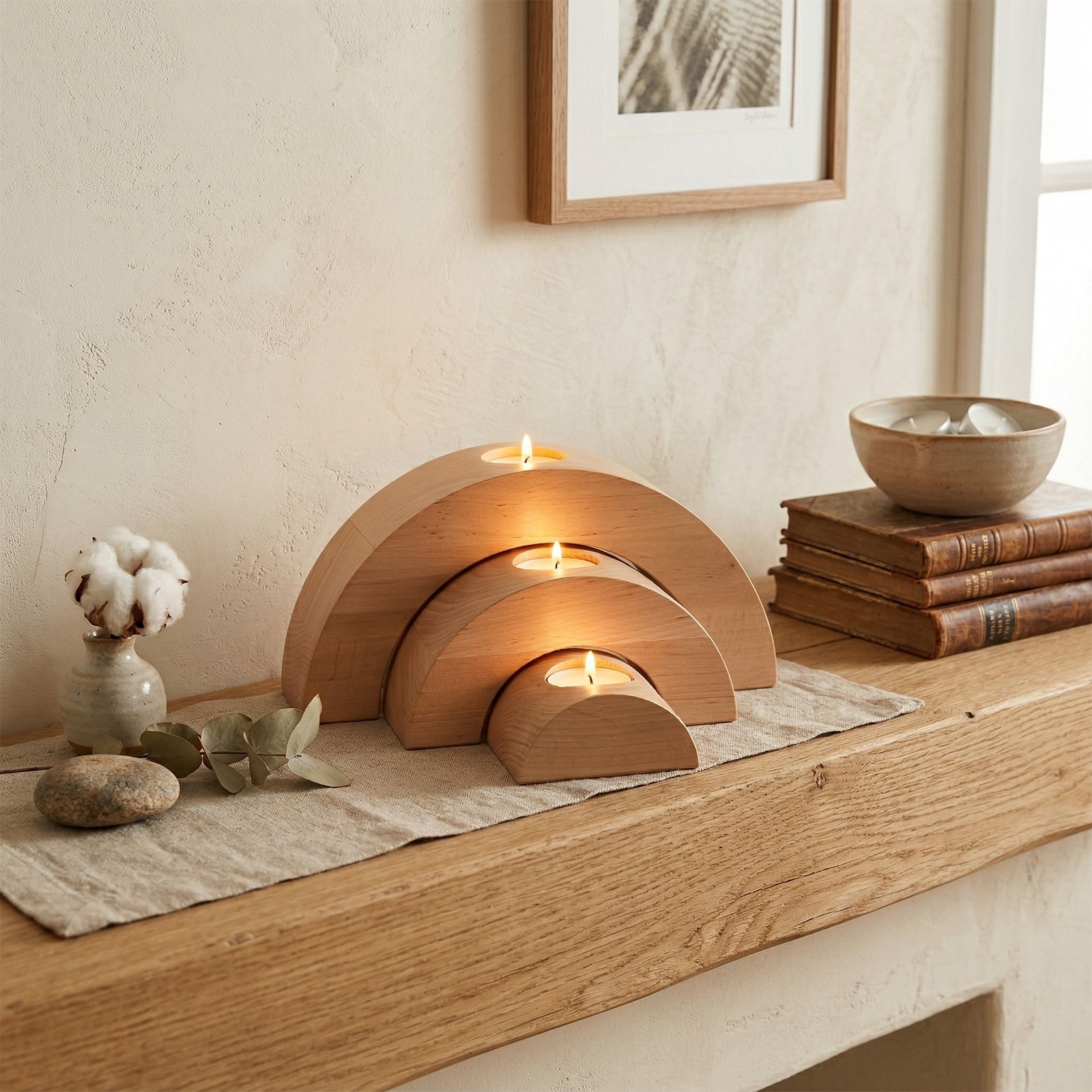 Diese runden, hölzern gestalteten Kerzenhalter im minimalistischen Design sind ideal für Teelichter. Dank ihrer ansprechenden Form passen sie in jeden Raum. Der halbrunde Kerzenhalter aus Erlenholz schafft eine gemütliche Atmosphäre und macht sich perfekt auf dem Tisch oder neben dem Kamin.