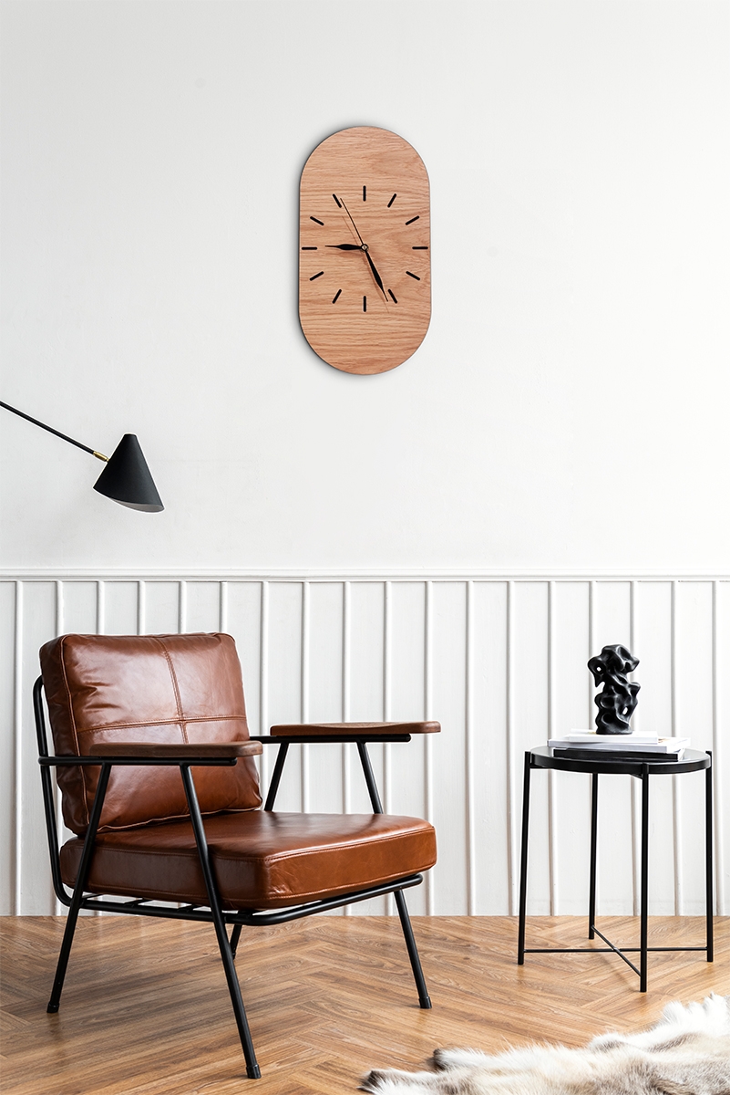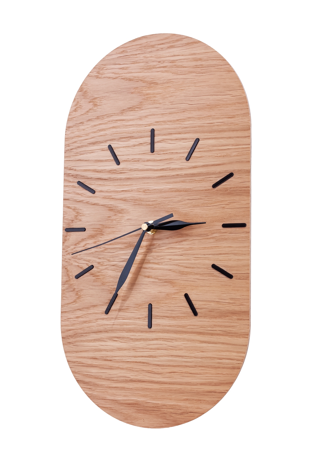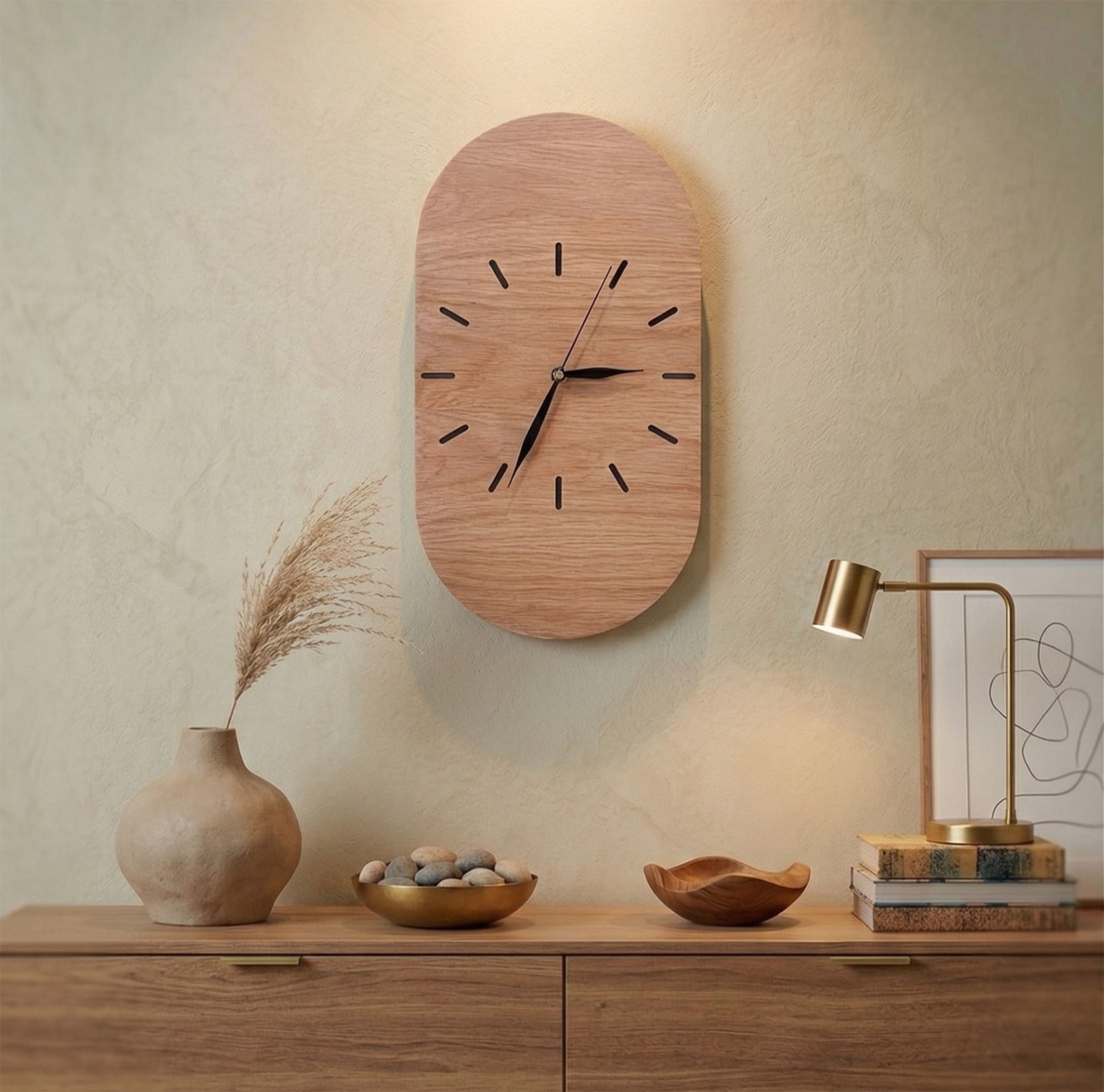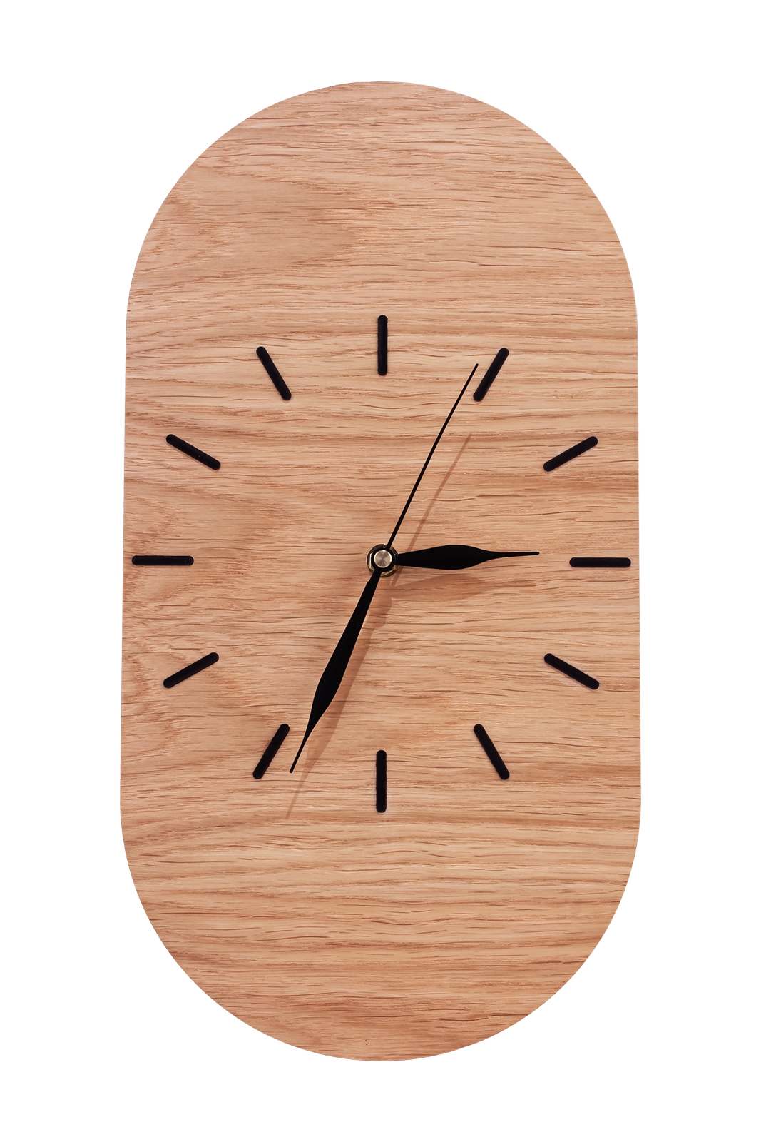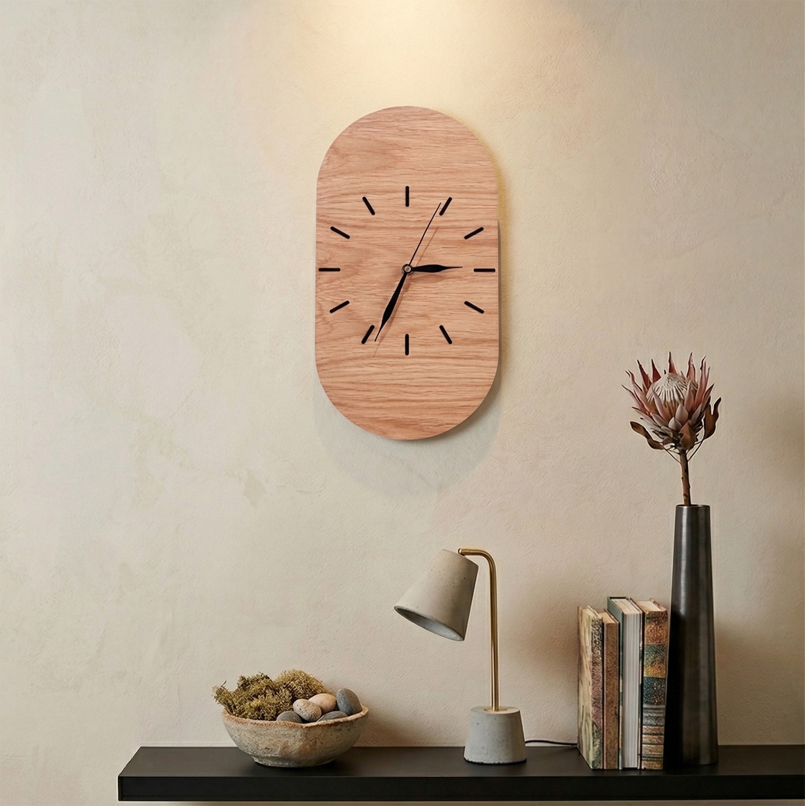 Schließen Sie die Tür zu einem harmonischen Wohnambiente. Diese elegante, ovale Uhr aus Eichenholz-Sperrholz vereint natürliche Schönheit, minimalistisches Design und Umweltbewusstsein. Dank ihres geräuschlosen Quarzwerks ist sie die ideale Wahl für Schlafzimmer, Wohnzimmer, Büro oder Kinderzimmer – sie stört die Ruhe nicht und verleiht dem Raum gleichzeitig eine dezente Note.