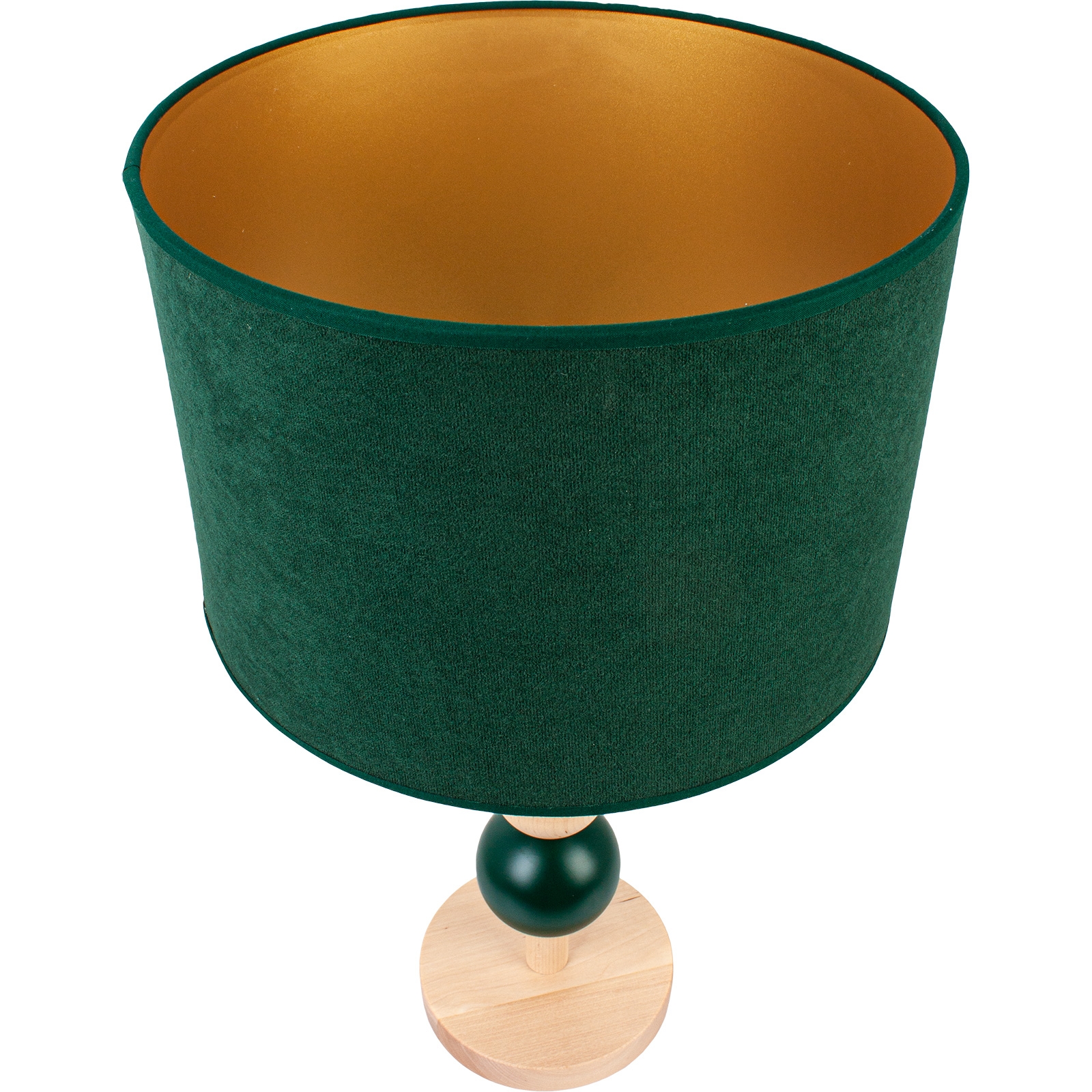 Der Lampenschirm ist ca. 31 cm breit und 20,5 cm hoch. Die Außenseite des Lampenschirms ist aus waldgrünem Veloursstoff gefertigt. Die Innenseite ist in einem warmen Goldton gehalten.
